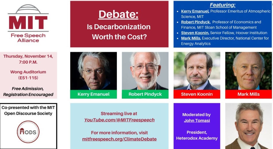 Mark your calendars and make a note. The MIT Free Speech Alliance has scheduled its next Great Debate. An all-star group of experts will gather at 7 PM on Nov. 14th, in Cambridge, to debate whether decarbonization will be worth the cost. The event will be expertly moderated by Heterodox Academy President John Tomasi. It's going to be another full house so register now!